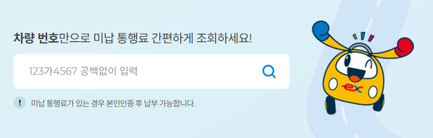 차량 번호만으로 미납 통행료 간편하게 조회하세요! 미납 통행료가 있는 경우 본인인증 후 납부 가능합니다.