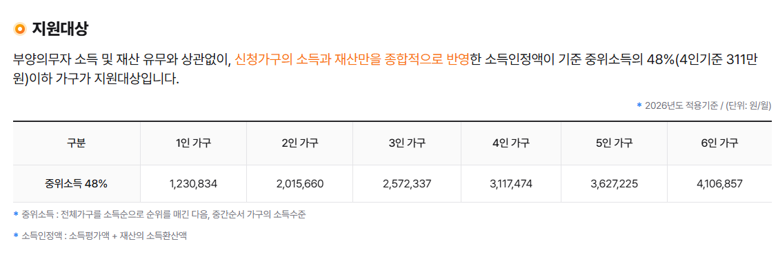 ✔ 기준 중위소득 48% 이하라면 신청 가능