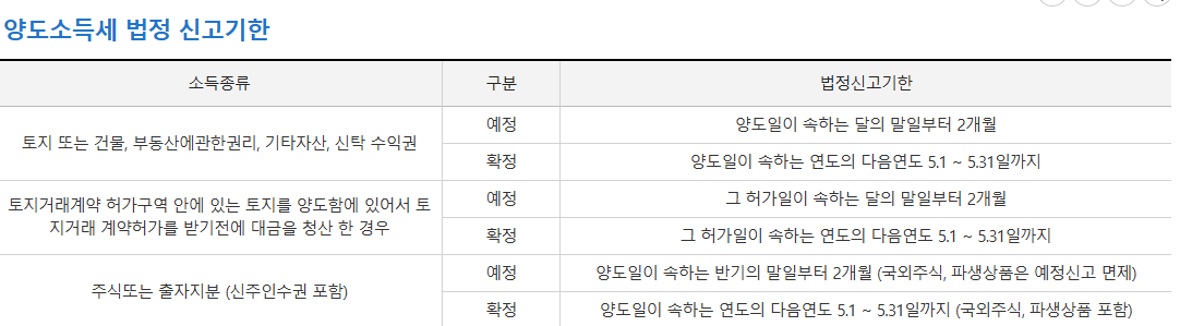 양도소득세는 자산 종류에 따라 신고기한이 다릅니다.