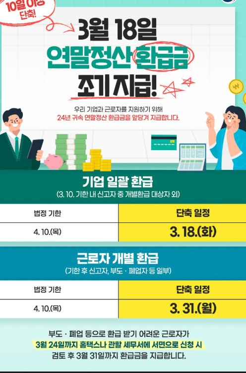 일반적으로 연말정산 환급금은 3월 말에서 4월 초 사이에 지급되지만, 올해는 조기 지급을 통해 보다 신속하게 환급금을 받을 수 있게 되었습니다.