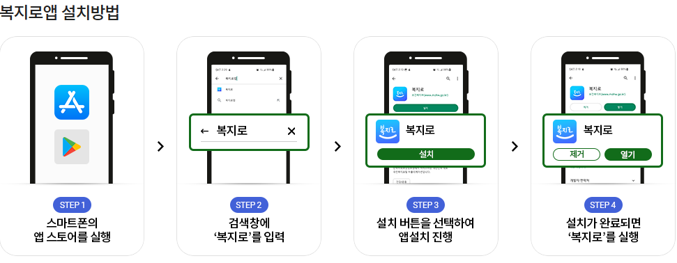 복지로 앱 다운로드: 스마트폰의 앱 스토어에서 '복지로' 앱을 검색하여 다운로드하고 설치합니다.