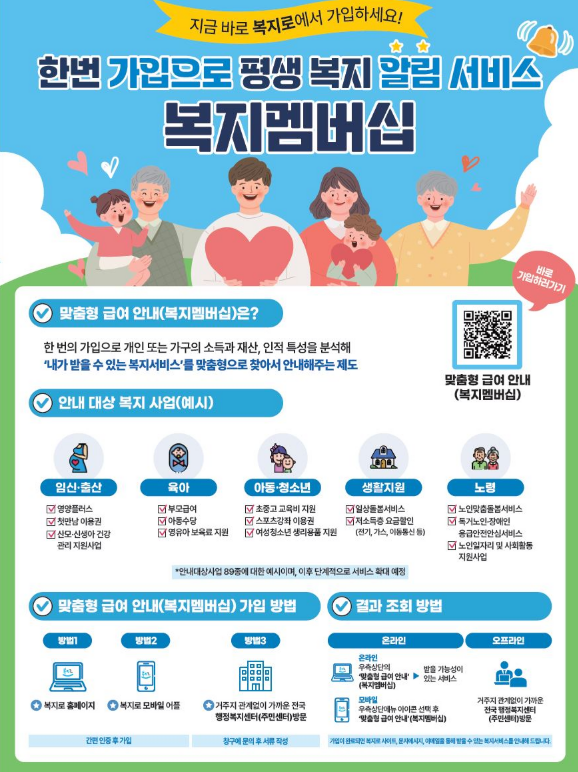 복지멤버십은 개인이나 가구의 연령, 가구 구성, 경제 상황 등을 기반으로 받을 수 있는 복지 서비스를 맞춤형으로 안내해주는 서비스입니다.