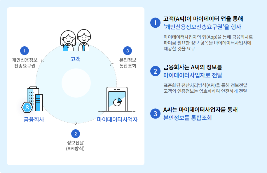 마이데이터는 개인이 자신의 금융 데이터를 직접 관리하고, 이를 바탕으로 맞춤형 금융 서비스를 제공받을 수 있는 시스템입니다.