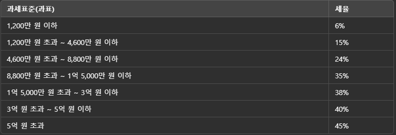 세율 적용 후 세금 계산: 과세표준에 따라 세율을 적용하여 산출세액을 계산합니다.