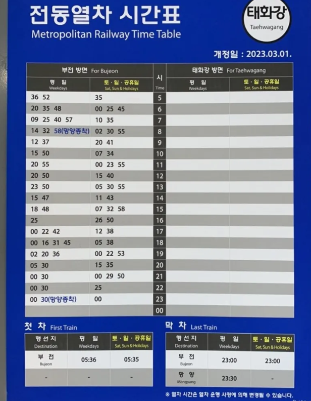 동해선 전철의 운행 특징은 첫차가 이른 시간에 시작되고, 막차는 밤 11시 전후에 종료된다는 점입니다. 아래는 태화강역 기준 일반적인 시각표 흐름입니다.