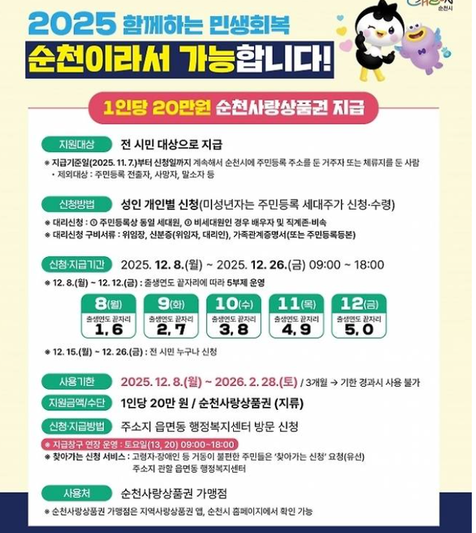 2025년 12월, 순천시가 전 시민에게 1인당 20만 원의 ‘민생회복지원금’을 지급했습니다.