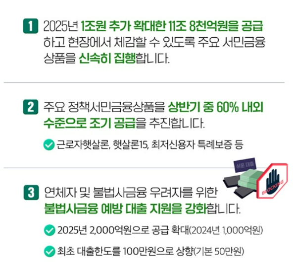 햇살론 및 미소금융 확대: 저소득·저신용 계층을 위한 서민금융 대표 상품인 햇살론과 미소금융의 지원 한도가 확대된다. 이는 신용등급이 낮아 대여가 어려운 사람들에게 실질적인 도움이 될 전망이다.